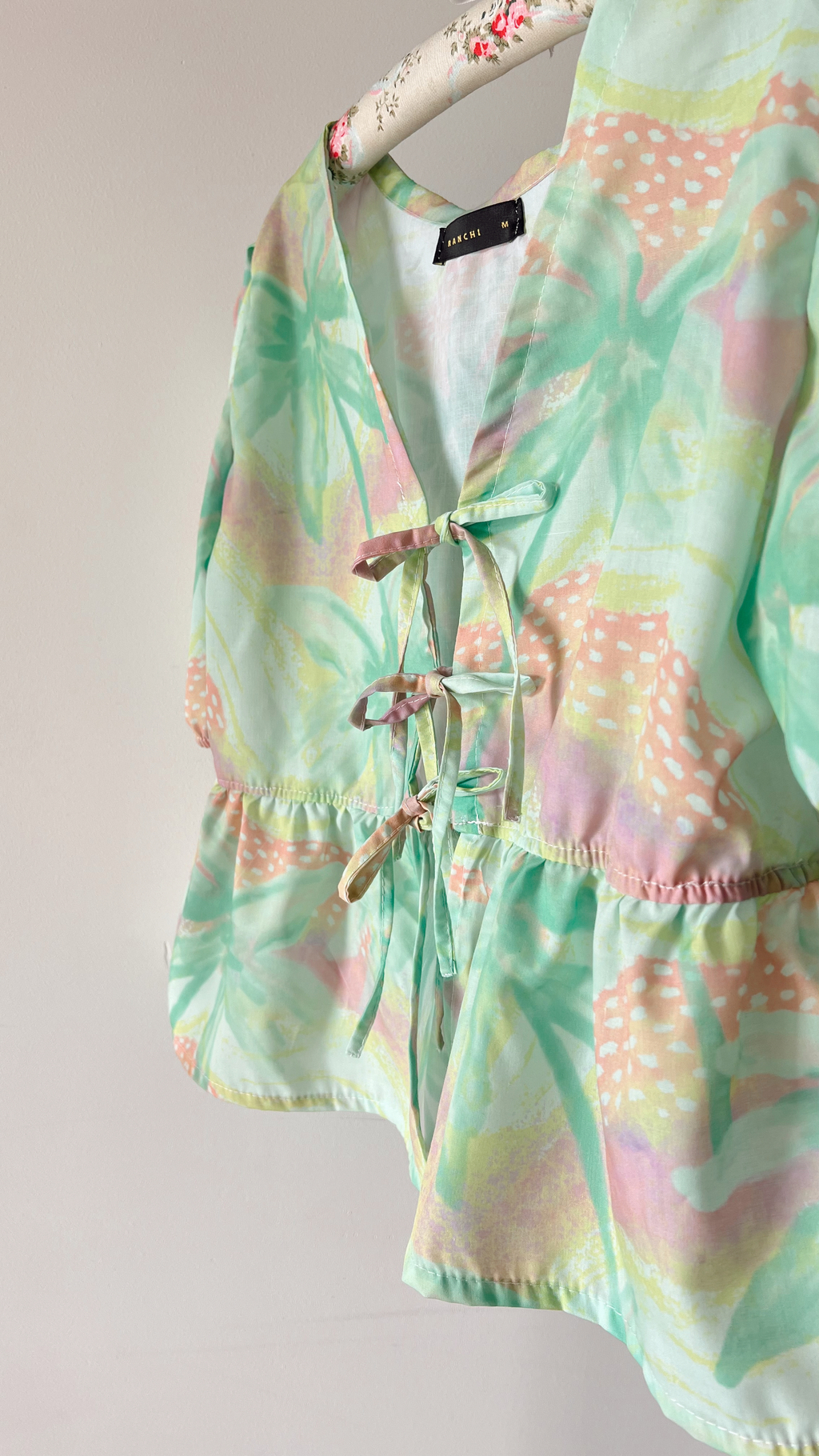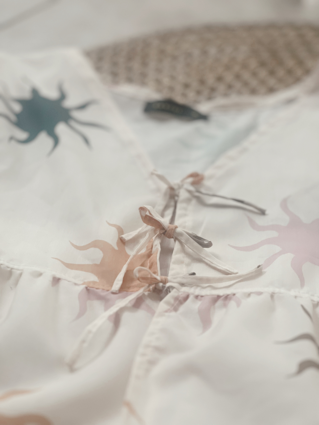 Bom dia (soles de colores) Mininas (fondo negro y chicas de colores) Coqueiros (color verde seco combinado con rosa) Bajo del mar (tela con peces azules) Orilla (tela en tonos verdes) Corales (tela fucsia con marrón y azul) Olas (tela en color verde militar con lila y verde agua)